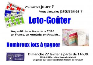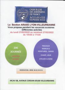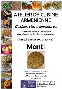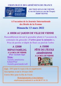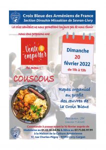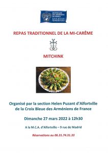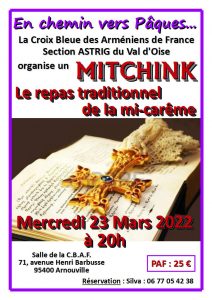 La Croix Bleue des Arméniens de France, section Astrig du Val d'Oise, organise, le repas traditionnel de la mi-carême (le mitchink). Nous vous donnons rendez-vous le mercredi 23 mars 2022, à 20 heures, à notre salle sise au 71 avenue Henri Barbusse à Arnouville (95400). Participation aux frais : 25 € par personne. Le nombre de places étant limité, réservez vite auprès de Silva : 06 77 05 42 38 Mitch