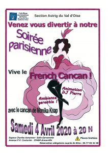Voir les détails »French Cancan : entrez dans la danse ! La Croix Bleue des Arméniens de France, section Astrig du Val d'Oise, organise une SOIREE PARISIENNE animée par DJPierre. Durant cette soirée, haute en couleurs, vous pourrez admirer le show des artistes de Monika KNAP. Jupons et levers de jambes, au son d'une musique entraînante, seront au rendez-vous. Rejoignez-nous le SAMEDI 4 avril 2020 à 20 h à l'Espace Charles Aznavour – Salle Garvarentz – avenue Paul Vaillant Couturier à Arnouville…