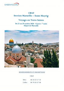 Voir les détails »CBAF Section Marseille – Sosse Mayrig Voyage en Terre Sainte Du 21 au 29 octobre 2020 – 8 jours / 7 nuits Départ de Marseille avec l'agence SABERATOURS Contact Tél : 01 42 61 51 13 e-mail : karen.canli@saberatours.fr | www.saberatours.fr Itinéraire Mercredi 21 octobre : MARSEILLE / TEL AVIV / JERUSALEM07h00 : rendez-vous à l’aéroport de Marseille Marignane 10h00 : envol de Marseille à destination de Tel Aviv par le vol Elal 322 14h55 : arrivée à l’aéroport…