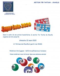 Dans le cadre de ses actions humanitaires, la section Ter Tavitian de Chaville organise son loto annuel le dimanche 22 mars 2020 à l'atrium de Chaville à partir de 14h30. Nombreux lots à gagner - Buffet de patisseries et de boissons Venez nombreux nous retrouver dans une ambiance amicale