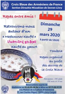 Voir les détails »Repas entre amis ! Dimanche 29 Mars 2020 à partir de 12h30 Retrouvons-nous autour d’un "Madzounov Keufté" (Keufté au yaourt) Tombola Repas organisé au profit des oeuvres de la Croix Bleue Participation : 30€ adulte 10€ moins de 10 ans Réservations auprès de Madeleine au 01.43.10.04.96 & Nilva au 07.71.00.97.99 à la Maison de la Culture Arménienne 17, rue Charles-Péguy - 93190 Livry-Gargan