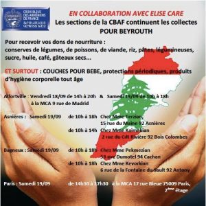 Voir les détails »Nous continuons nos collectes à destination de Beyrouth dans les sections d’Alfortville, d’Asnières, de Bagneux et de Paris... Cette semaine, en collaboration avec Elise Care Les jours et heures d’accueil sont indiqués ci-dessous LISTE DÉTAILLÉE DES PRODUITS BIENVENUS Denrées non périssables : Conserves (poisson, légumes), pâtes, riz, blé, huile, tablettes de chocolat Hygiène : Brosses à dent, dentifrice, serviettes hygiéniques (ni savon, ni gel douche, ni shampoing) Enfants : Couches, lait en poudre, Crayons de couleur, feutres, livres coloriages (neufs…
