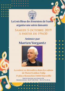 La Croix Bleue des Arméniens de France Section de Marseille Organise une Soirée dansante animée par Marten Yorgants Le 5 Octobre 2019 à 19h30 Dans les salons de l'hotel golden Tulip 13008 Marseille Participation aux frais : 65€ Reservations : 06 07 38 35 02 / 06 16 96 40 26