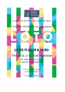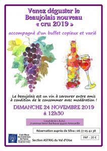 Voir les détails »La Croix Bleue des Arméniens de France, section Astrig du Val d'Oise, vous convie à fêter l'arrivée du « BEAUJOLAIS NOUVEAU » autour d'un buffet copieux, le DIMANCHE 24 NOVEMBRE 2019 à 12H30 au 71 avenue Henri Barbusse à Arnouville. Participation aux frais : 20 € Réservation auprès de Silva : 01 39 85 70 42