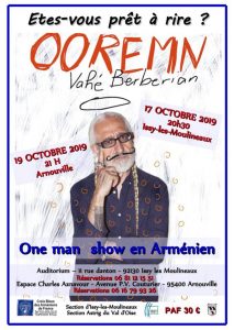 Voir les détails »La Croix Bleue des Arméniens de France présente Vahé BERBERIAN pour son ONE MAN SHOW "OOREMN"! Le 19 OCTOBRE 2019 à 21H à l' Espace Charles Aznavour d'Arnouville, avenue Paul Vaillant Couturier. Réservations : 06. 16.79.93.26