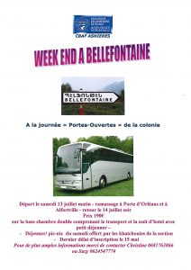 Voir les détails »La section d'Asniere organise un Week-end à Bellefontaine pour la journée " portes-ouvertes" de la colonie , ramassage à porte d'Orléans Depart le Samedi 13 juillet et retour le 14 juillet au soir Tarif 190 € Reservations Christine : 06 81 76 38 66 Suzy : 06 24 54 77 74