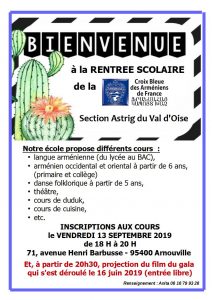 Voir les détails »Notre école propose différents cours : ● langue arménienne (du lycée au BAC), ● arménien occidental et oriental à partir de 6 ans, (primaire et collège) ● danse folklorique à partir de 5 ans, ● théâtre, ● cours de duduk, ● cours de cuisine, ● etc. INSCRIPTIONS AUX COURS le VENDREDI 13 SEPTEMBRE 2019 de 18 H à 20 H 71, avenue Henri Barbusse - 95400 Arnouville Et, à partir de 20h30, projection du film du gala qui s'est déroulé…