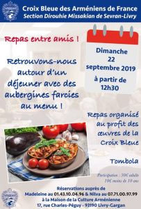 Voir les détails »La Section Dirouhie Missakian de Sevran-Livry organise un Repas entre amis ! Retrouvons-nous autour d’un déjeuner avec des aubergines farcies au menu ! Repas organisé au profit des oeuvres de la CBAF Participation : 30€ adulte 10€ moins de 10 ans Renseignements et Reservations aupres de Madeleine au 01 43 10 04 96 ou Nilva 07.71.00.97.99 Maison de la Culture Arménienne 17, rue Charles-Péguy - 93190 Livry-Gargan
