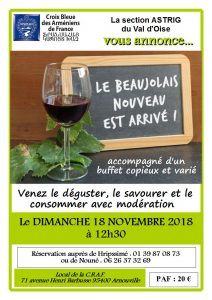 Voir les détails »Il arrive... le BEAUJOLAIS NOUVEAU fait traditionnellement son arrivée ! Serez-vous prêts pour la dégustation ? La Croix Bleue des Arméniens de France, section Astrig du Val d'Oise, vous propose de le consommer, mais avec modération bien sûr, le DIMANCHE 18 NOVEMBRE 2018 à 12H30 au 71 avenue Henri Barbusse à Arnouville. Participation aux frais : 20 € Réservation auprès de Hripssimé : 01 39 87 08 73 ou de Nouné : 06 26 37 32 69