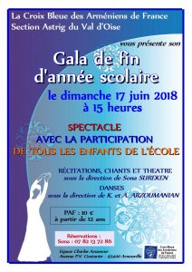Gala de fin d'année La Croix Bleue des Arméniens de France, section Astrig du Val d'Oise, vous annonce son gala de fin d'année scolaire qui aura lieu le dimanche 17 juin 2018 à 15 H à l'Espace Charles Aznavour – avenue Paul Vaillant Couturier à Arnouville (95400). Au programme : récitations, chants, théâtre et danses ! Ne manquez surtout pas ce rendez-vous ! Vous aurez ainsi la joie d'admirer les prestations de tous les enfants de l'école. Renseignements et réservations auprès de Sona…