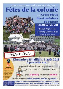 Voir les détails »Le Dimanche 15 Juillet à 11h FETE DE LA COLONIE DE LA CROIX BLEUE DES ARMENIENS DE FRANCE Spectacle des colons, Expositions, Jeux, Tournois, Buffet, Bar.. Venez en Famille, Venez avec vos amis... Pensez à aporter table pliante, chaises et parasols Colonie de la Croix Bleue des Arméniens de France 39400 Bellefontaine Infos : Sections de la CBAF & 01 53 34 18 18 PS : Retransmission de la finale de la coupe du monde 2018 sur ecran…
